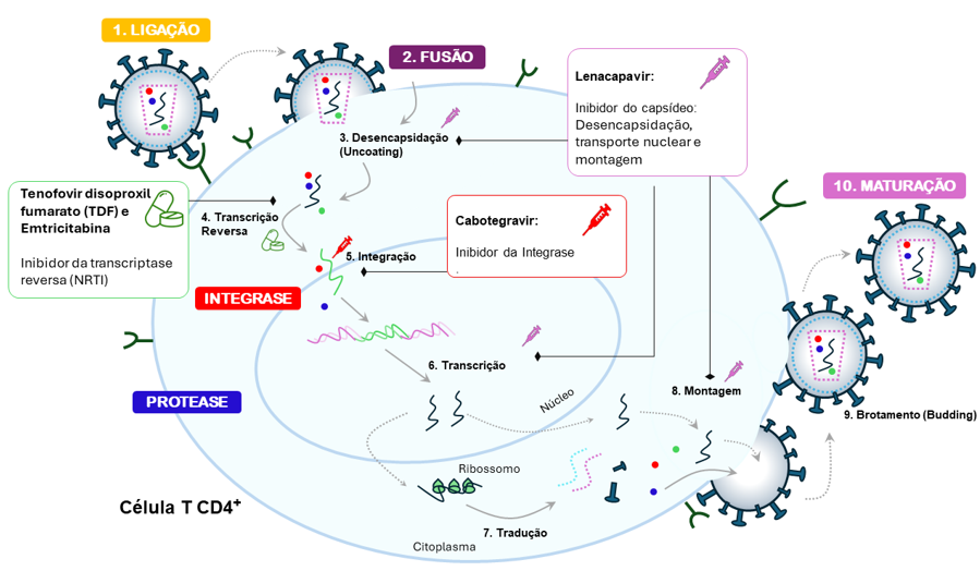 No contexto das limitações da via oral, diversos autores têm destacado o potencial das formulações injetáveis de longa duração como alternativa capaz de reduzir o impacto da adesão diária sobre a proteção preventiva. De acordo com O’Halloran et al. (2024) e Marzinke et al. (2023), tanto o cabotegravir intramuscular bimestral quanto o lenacapavir subcutâneo semestral mantêm concentrações plasmáticas sustentadas, promovendo níveis de proteção contínuos contra a infecção pelo HIV. Estudos de Bekker et al. (2023) e Landers et al. (2024) também demonstram maior aceitação, melhor experiência do usuário e aumento da retenção em populações-chave quando comparadas à PrEP oral, principalmente devido à conveniência das aplicações espaçadas. Essa vantagem é ainda reforçada por Magnus et al. (2024), que evidenciam maior efetividade da PrEP injetável em contextos de maior vulnerabilidade e risco. A dinâmica de atuação farmacológica dos antirretrovirais utilizados em ambas as modalidades pode ser observada de forma esquemática na Figura 1, que ilustra os pontos exatos do ciclo replicativo do HIV onde cada fármaco exerce sua ação.