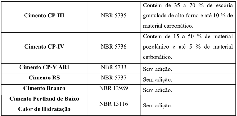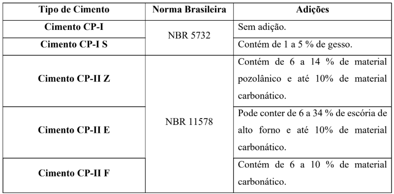 No contexto do mercado brasileiro, encontram-se atualmente cinco tipos principais de cimento Portland, além de três variações de caráter especial. Embora todos possam ser aplicados em obras de uso geral na construção civil, cada tipo apresenta propriedades específicas que determinam seu melhor desempenho conforme a finalidade estrutural desejada. Essa diversidade possibilita a obtenção de concretos com boa resistência mecânica, durabilidade e viabilidade econômica (PUGLIESI, 2016; BATTAGIN; RODRIGUES, 2014). A Tabela 1 apresenta os diferentes tipos de cimento disponíveis no mercado nacional, suas respectivas normas técnicas de referência e as principais adições incorporadas em sua composição.