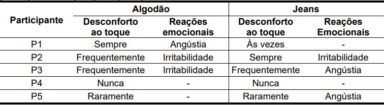 No algodão e no jeans, verificou-se que 40% não demonstraram reações negativas, enquanto 60% manifestaram irritabilidade e angústia, o que resultou na evitação do uso desses tecidos. P1 apresentou desconforto tanto ao toque ao algodão e o jeans em relação ao toque e reações de angústia somente no algodão, já a participante P2 relatou sentir frequentemente desconforto ao toque no algodão e no jeans sempre, e irritabilidade em ambos, P3 possui desconforto ao toque frequentemente tanto no algodão e jeans, irritabilidade no algodão e angústia no jeans. e participante P4 nunca sentiu desconforto ao toque em ambos os tecidos. P5 raramente sente desconforto no algodão e jeans e angústia apenas no jeans.