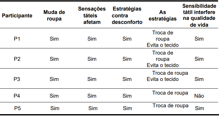 Observou-se que todos os participantes relataram mudança de roupa ou evitação de tecidos desconfortáveis como forma predominante de enfrentamento, evidenciando que as estratégias autorregulatórias estão baseadas na evitação do estímulo e não na adaptação ao mesmo.