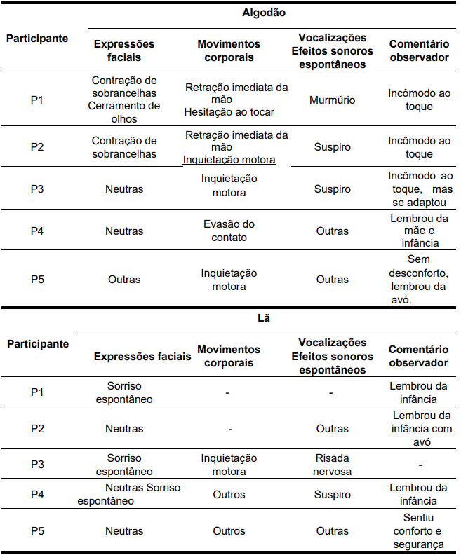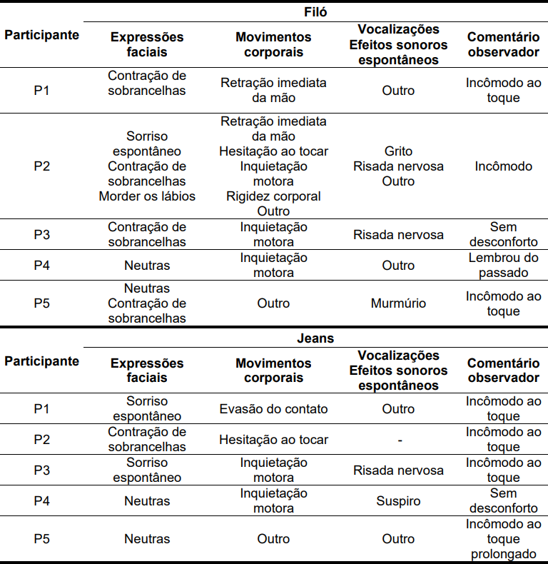 Os participantes P1 e P2 demonstraram contração de sobrancelhas e retração imediata das mãos ao toque do tecido. Além disso, houve hesitação ao tocar, acompanhada de incômodo evidente, refletido em vocalizações como murmúrios e suspiros. Os movimentos corporais desses participantes também se mostraram mais inquietos, indicando uma reação sensorial intensa.