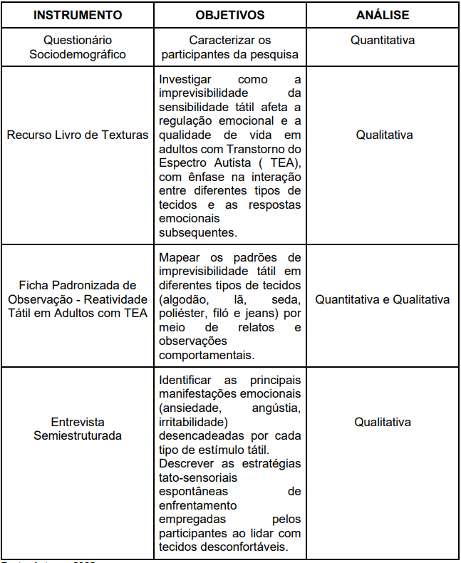 O estudo teve como objetivo geral investigar como a imprevisibilidade da sensibilidade tátil afeta a regulação emocional e a qualidade de vida de adultos com Transtorno do Espectro Autista (TEA), enfatizando a interação entre diferentes tipos de tecidos e nas respostas emocionais subsequentes. Especificamente foi caracterizar o perfil dos participantes; mapear os padrões de imprevisibilidade tátil em diferentes tecidos (algodão, lã, seda, poliéster, filó e jeans); identificar manifestações emocionais associadas aos estímulos táteis e descrever as estratégias espontâneas de enfrentamento utilizadas diante de desconfortos sensoriais.