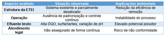 O Quadro 1 a seguir apresenta uma síntese analítica das principais condições estruturais, operacionais e ambientais observadas antes da adequação da ETEI.