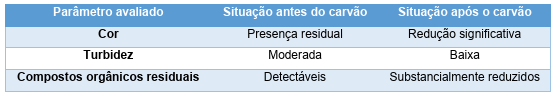 Os resultados corroboram os achados de Bansal e Goyal (2005), que destacam a elevada capacidade de adsorção do carvão ativado na remoção de compostos orgânicos dissolvidos.