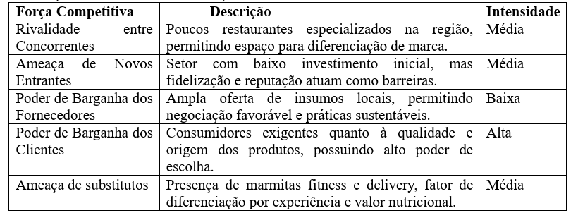 Dessa forma, a aplicação da matriz SWOT permite uma visão completa da posição estratégica do restaurante, conforme abordado nos estudos de Oliveira (2023). Para complementar essa análise e aprofundar o entendimento sobre o nível de competitividade do setor alimentício, é de suma importância empregar o modelo das Cinco Forças de Porter.