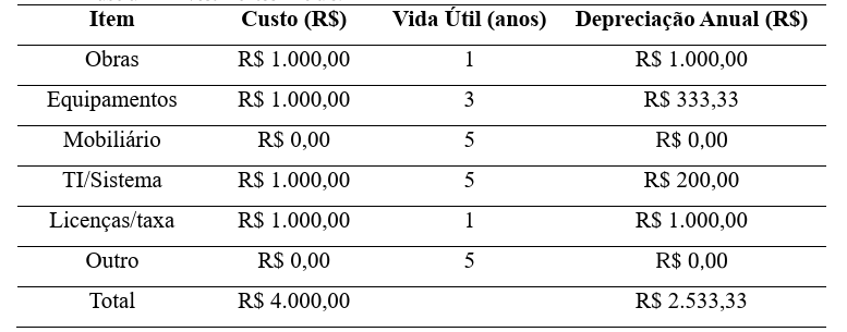 A Tabela 1 apresenta o detalhamento dos bens de capital alocados e seus respectivos cálculos de depreciação anual.