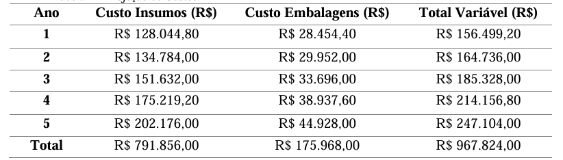 Do mesmo modo, as embalagens também compõem os custos variáveis, com valor médio de R$ 3,00 por refeição, que variam conforme o número de refeições vendidas. A Tabela 2 ilustra a projeção dos custos variáveis ao longo do horizonte de cinco anos, refletindo o aumento progressivo das vendas.