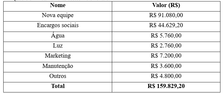 Conforme a metodologia do estudo, a expansão das operações para o turno noturno irá aproveitar a infraestrutura física, equipamentos e mobiliário já instalados. Dessa forma, os itens de investimento irão limitar-se a despesas pontuais e essenciais para a nova operação, como pequenas obras, aquisição de equipamentos específicos, licenças e sistemas de TI.