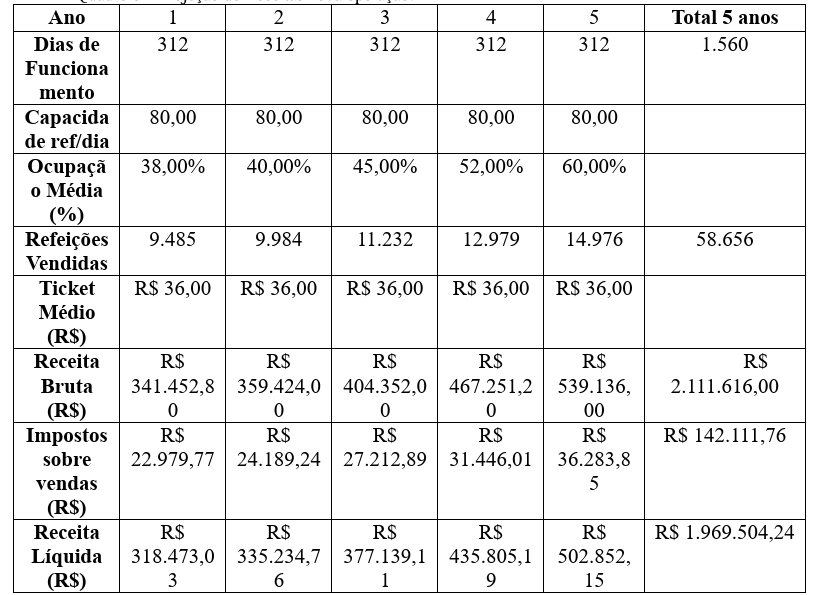 Nesse sentido, adotando uma capacidade máxima de atendimento de 80 refeições por dia, com funcionamento previsto para 312 dias ao ano. O Ticket Médio permanece constante em R$ 36,00 ao longo de todo o período. Esse valor foi definido a partir, da análise de mercado e da composição esperada do mix de produtos, composta por opções de maior valor agregado.