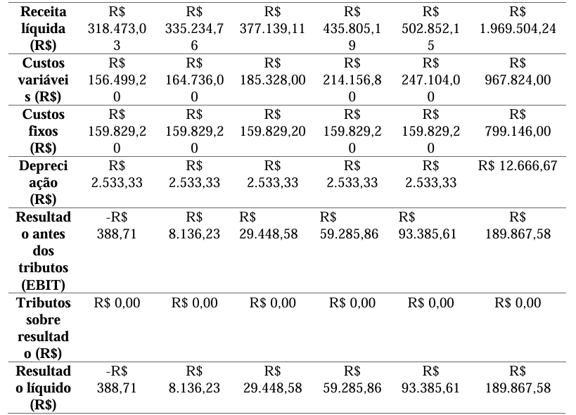 Conforme apresentado no Quadro 6, a Receita Bruta acumulada para o período de cinco anos totaliza R$ 2.111.616,00. Esse desempenho resulta da estratégia de maturação de mercado, permitindo que a Receita Líquida alcance R$ 502.872,95 no último ano projetado.