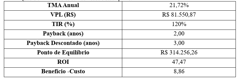Os indicadores de viabilidade, apresentados no Quadro 7, fornecem uma visão consolidada sobre a atratividade do investimento proposto, conforme os critérios de decisão abordados, tomando como base uma Taxa Mínima de Atratividade (TMA) de 21,72%.