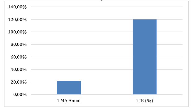 O Valor Presente Líquido (VPL) do projeto resultou em R$ 81.550,87. Por ser um valor positivo, o projeto é considerado economicamente viável, pois a rentabilidade gerada supera o custo de capital estabelecido pela TMA. Essa criação de riqueza é complementada pela Taxa Interna de Retorno (TIR), calculada em 120% a.a. A TIR, por ser significativamente superior à TMA (21,72%), como mostra o gráfico 2, confere uma alta margem de segurança e reafirma a atratividade do investimento. Adicionalmente, o Retorno sobre o Investimento (ROI) de 47,47 indica que, para cada real investido no projeto, houve um retorno de R$ 47,47 ao longo do período, confirmando o alto desempenho financeiro.