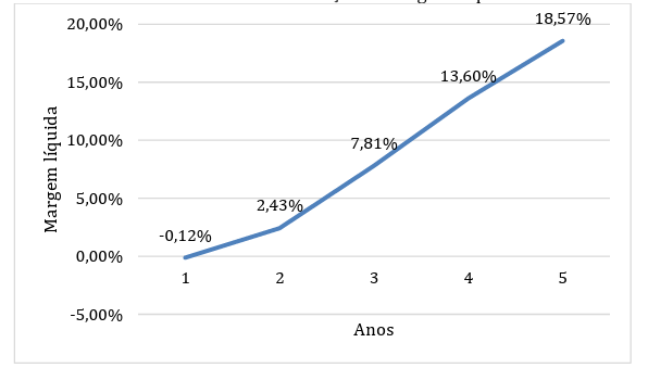 Os indicadores de rentabilidade operacional, detalhados na Tabela 5, refletem a eficiência do projeto. A Margem de Contribuição permanece estável em 50,86% em todos os anos, confirmando que mais da metade da receita está disponível para cobrir os custos fixos e gerar lucro. Por sua vez, a Margem Líquida e a Margem Operacional demonstram uma progressão ascendente, partindo de um resultado negativo de -0,12% no Ano 1 e atingindo 18,57% no Ano 5 conforme ilustrado abaixo no gráfico 4.
