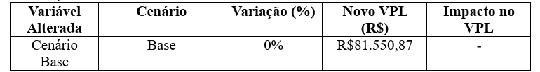 A análise de sensibilidade avalia como mudanças em premissas-chave podem afetar indicadores como VPL e TIR. Conforme Gitman (2010), essa técnica reconhece que projeções carregam incertezas relacionadas à demanda, custos e preços. O quadro 8 apresenta a Análise de Cenários de Viabilidade, avaliando como o Valor Presente Líquido (VPL) é impactado por variações nas premissas mais críticas.