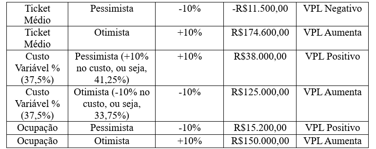 Por outro lado, o projeto demonstra ser mais robusto em relação às variações de Custo Variável e Crescimento de Ocupação. Mesmo com um aumento de 10% nos Custos Variáveis (atingindo 41,25% sobre o ticket), o VPL permanece positivo, assim como no cenário pessimista de queda na ocupação.