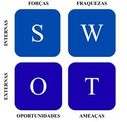 O quadro SWOT, como mostra a figura abaixo, é construído a partir da identificação e organização desses quatro elementos em uma matriz. As forças e fraquezas correspondem aos fatores internos à organização, enquanto as oportunidades e ameaças são fatores externos ligados ao ambiente de mercado.