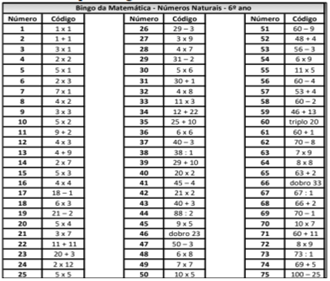 O funcionamento deste bingo comumente se dá no 6° ano do Ensino Fundamental e é composto por uma sequência de etapas. Inicialmente, o professor sortia um número e verifica o código a ele correspondente. O código corresponde a uma operação matemática correspondente ao número sorteado, a qual é ditada ou escrita no quadro. O vencedor do bingo é aquele que conseguir completa a quina, seja ela na vertical, horizontal ou diagonal (Amaral, 2023). Essa é uma perspectiva divertida de aprendizagem matemática, pois a depender da forma como ela é conduzida, faz com que os estudantes se sintam engajados a fazer as operações matemáticas correspondentes aos números sorteados, o que demanda participação dos alunos (FORMIGA, 2021).