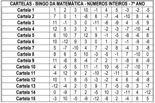 Figura 2: Bingo de Números Inteiros de Matemática