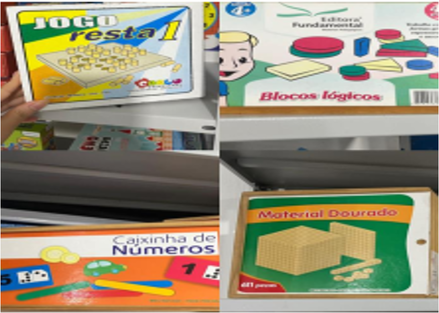 O recurso da observação adotado por Barros (2024) é apontado por Beletti (2025) como a solução encontrada por professores que lidam com alunos com deficiência e que por vezes não possem a formação necessária para lidar com os desafios dessa modalidade educacional. Dentre os elementos que integram a educação inclusiva, em especial o ensino de Matemática, tem-se o segmento conhecido como Atendimento Educacional – AEE (Brasil, 2009; 2011). Segundo Castro (2024), o AEE é praticado no turno inverso ao qual o aluno se encontra matriculado, tendo como local a Sala de Recursos Multifuncionais, a qual no estudo de Barros (2024) se caracterizou pela existência de materiais lúdicos, conforme está retratado na Figura 3.