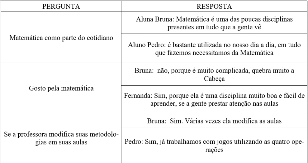Nas falas dos alunos respondentes, nota-se questões relevantes, tais como o reconhecimento da Matemática como disciplina essencial para o seu respectivo desenvolvimento e aprendizagem. Consoante o que se vê na Base Nacional Comum Curricular (Brasil, 2018), o domínio da Matemática é necessário para que o aluno consiga resolver problemas por meio da aplicação de conhecimentos sob uma égide analítica, o que deve ser trabalhado pelos professores em sala de aula.