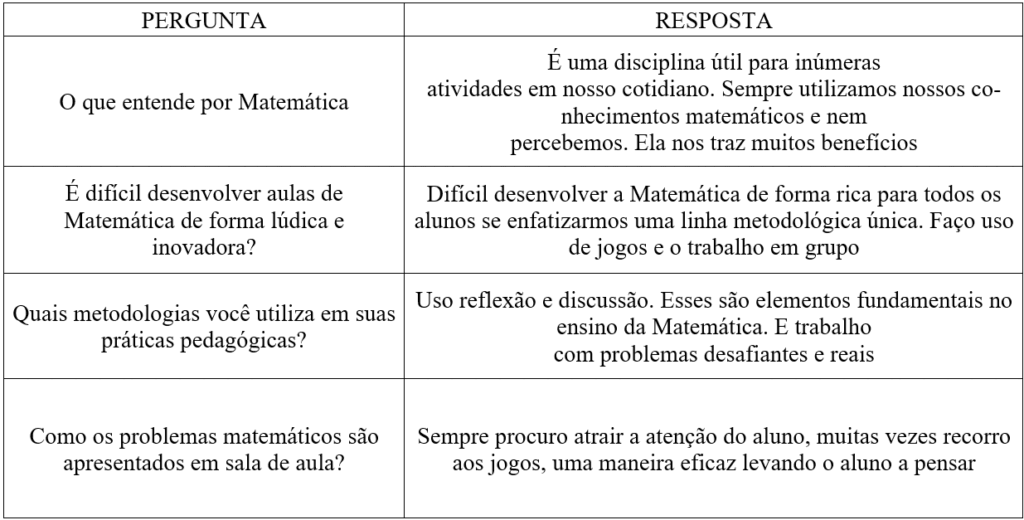 O Quadro 1 exibe alguma das respostas que foram captadas por Silva, Souza e Cruz (2020) junto a professora que respondeu as indagações do questionário que a ela fora dirigido.