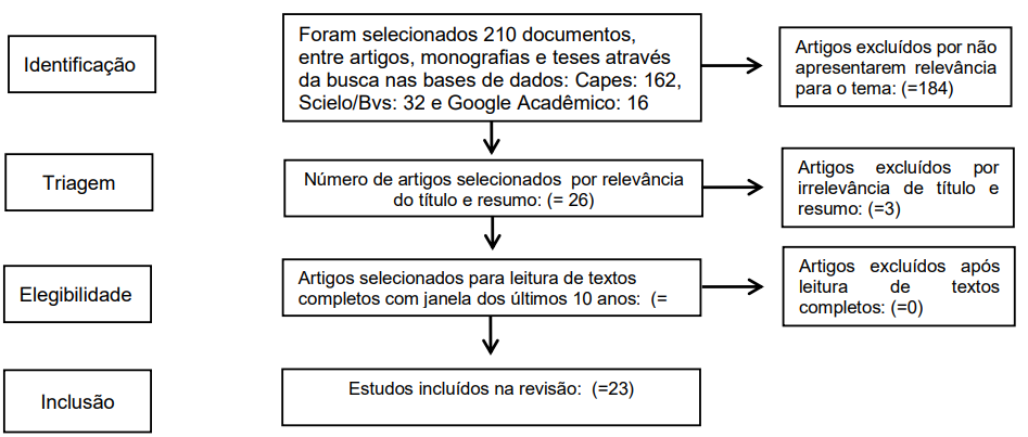 A busca inicial resultou em 210 literaturas. Foram excluídos na primeira fase por não apresentarem relevância para o tema, 184 estudos. Na segunda triagem, após a leitura e relevância do tema, foram excluídos 3 artigos. Para inclusão e discussão do tema, foram selecionados 23 estudos com publicação nas janelas dos últimos 10 anos (figura 1).