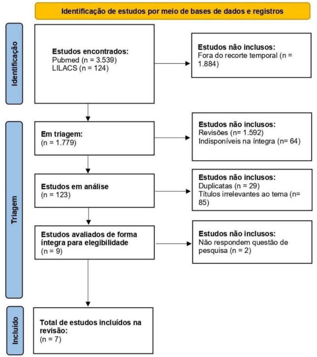 Na seleção dos estudos, foram identificados inicialmente 3.539 estudos na base PubMed e 124 na LILACS. Após a remoção de 1.884 estudos que estavam fora do recorte temporal, restaram 1.779 para triagem. Desses, 1.592 foram excluídos por serem revisões e 64 por estarem indisponíveis na íntegra, totalizando 123 estudos em análise. Em seguida, 29 duplicatas e 85 com títulos irrelevantes foram eliminados. Restaram 9 estudos avaliados na íntegra, dos quais 2 foram excluídos por não responderem à questão de pesquisa. Por fim, sete estudos foram incluídos na revisão (Figura 1). O Quadro 01 reúne os sete estudos selecionados, dos quais cerca de 43% (3 estudos) focam em crianças, aproximadamente 29% (2 estudos) em adolescentes e os restantes 29% (2 estudos) em adultos. Esses estudos abrangem diferentes países, incluindo Itália, Brasil, China, Tailândia, Cazaquistão e Peru, mostrando a diversidade das populações analisadas e a importância de considerar as faixas etárias e contextos regionais para entender melhor os fatores associados à ocorrência da RA.