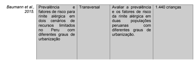 BAUMANN, L. M. et al. Prevalence and risk factors for allergic rhinitis in two resource‐ limited settings in Peru with disparate degrees of urbanization. Clinical & Experimental Allergy, v. 45, n. 1, p. 192-199, 2015.