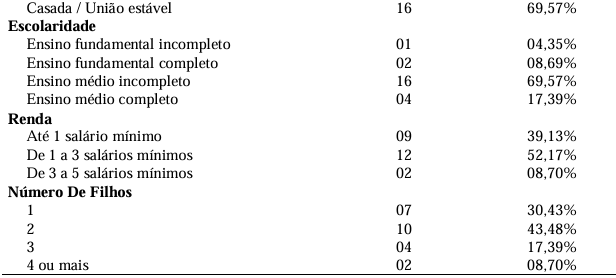 A análise dos dados sociodemográficos demonstra um perfil semelhante ao identificado em estudos nacionais sobre mulheres no período puerperal, caracterizado predominantemente por adultas jovens, com idades entre 20 e 39 anos (86,96%), casadas ou em união estável (69,57%), com escolaridade de nível médio (69,57%) e renda familiar mensal de até três salários mínimos (52,17%). Observou-se ainda que a maioria das participantes possuía dois filhos (43,48%).