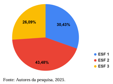 O Gráfico 1 demonstra a distribuição das 23 puérperas incluídas no estudo entre as diferentes unidades da ESF avaliadas. Observa-se que a amostra está relativamente equilibrada entre as unidades, permitindo a análise do acompanhamento puerperal no contexto das diversas equipes da atenção primária à saúde.