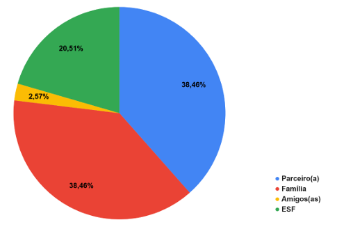 O gráfico demonstra que o apoio às puérperas durante o período puerperal é majoritariamente oferecido por parceiros(as) e familiares, ambos com 38,46%. As equipes da Estratégia de Saúde da Família (ESF) são responsáveis por 20,51% do suporte, enquanto amigos(as) apresentam participação mínima (2,57%). Esses dados indicam que, embora a rede familiar seja central, a atuação da ESF ainda é limitada e poderia ser fortalecida para garantir acompanhamento integral.