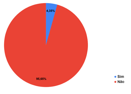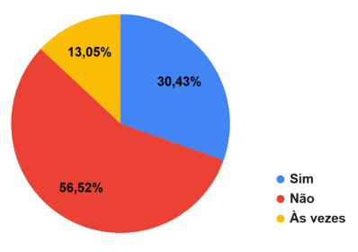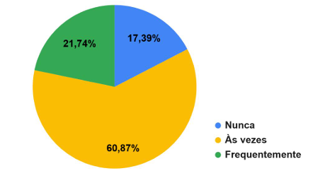 O gráfico acima demonstra a percepção das puérperas sobre a sobrecarga nos cuidados domésticos e com o bebê. Observa-se que 60,87% relataram sentir sobrecarga “às vezes”, 21,74% perceberam sobrecarga frequente e 17,39% indicaram nunca sentir sobrecarga. Esses dados evidenciam que a maior parte das mulheres vivenciam algum grau de sobrecarga relacionada às tarefas do cuidado infantil e doméstico durante o período puerperal.