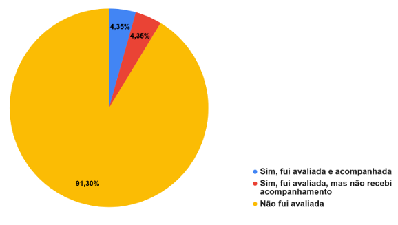 O gráfico evidencia uma falha significativa das Estratégias de Saúde da Família (ESF) no acompanhamento psicológico das puérperas. 91,30% das mulheres não receberam qualquer avaliação quanto à sua saúde mental no período pós-parto. Apenas 4,35% foram avaliadas e acompanhadas, enquanto outros 4,35% passaram pela avaliação sem receber acompanhamento posterior, apontando lacunas claras na continuidade do cuidado.