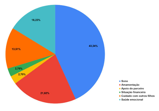 Os dados apresentados indicam que a principal dificuldade enfrentada pelas puérperas foi a alteração do sono (43,24%), seguida pela amamentação (21,62%) e pela saúde emocional (16,23%). Em menor proporção também foram relatadas dificuldades relacionadas ao cuidado com outros filhos (13,51%), à situação financeira (2,70%) e ao apoio do parceiro(a) (2,70%). Esses resultados evidenciam que o período pós-parto envolve demandas simultâneas que afetam aspectos físicos, emocionais e sociais, exigindo da mulher grande capacidade de adaptação às mudanças desse ciclo (Baratieri et al., 2023; Grillo et al., 2024).