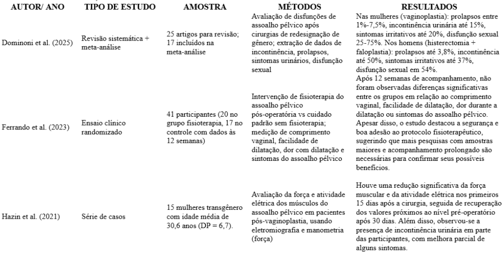 Legenda: Avaliações e protocolos fisioterapêuticos aplicados no pós-operatório de cirurgias de redesignação de gênero apresenta os principais estudos encontrados na literatura, com identificação do autor e ano, tipo de estudo, amostra, métodos empregados e resultados observados, destacando as intervenções fisioterapêuticas voltadas à reabilitação e recuperação funcional no período pós-operatório.
