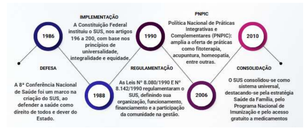No Brasil a saúde é reconhecida como um direito universal, sendo responsabilidade do Estado garantir políticas que reduzam riscos e assegurem, de maneira igualitária, os serviços de promoção, prevenção e recuperação da saúde (BRASIL., 1988). Vale ressaltar que a consolidação do Sistema Único de Saúde (SUS) ocorreu a partir da Constituição Federal de 1988 e das Leis nº 8.080/1990 e nº 8.142/1990, posteriormente, a Política Nacional de Práticas Integrativas e Complementares (PNPIC) foi instituída em 2006 (AMADO et al., 2018) de forma ilustrativa (Figura 1) apresenta-se a linha do tempo evidenciando o marco histórico dessa implementação (RODRIGUES, 2025).