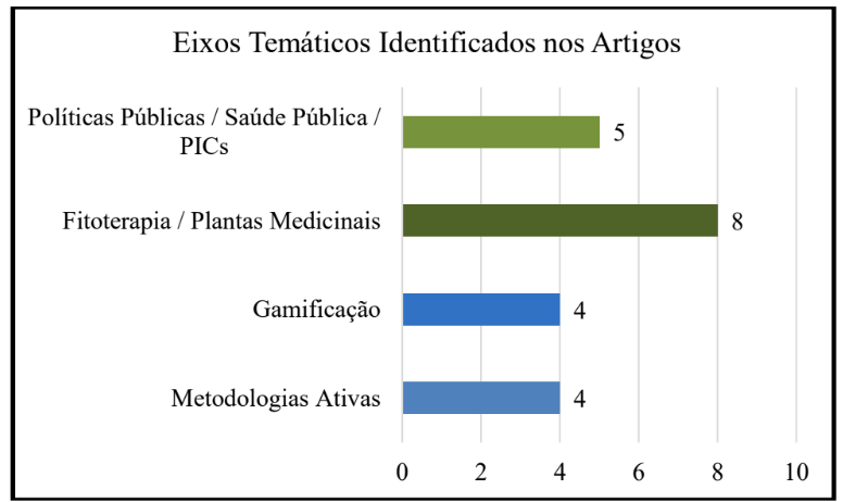 Quanto aos critérios de inclusão e exclusão, foram levantados em torno de 45 artigos relacionados ao estudo de interesse, contemplando materiais publicados em português e inglês que atendiam os critérios definidos para a revisão, sendo 21 artigos escolhidos conforme (Figura 3) e 3 cartilhas do Ministério da Saúde que atenderam aos critérios de inclusão, mas extrapolavam o critério dos últimos 5 anos, entre os anos de 2012 a 2019 totalizando 6 publicações e a Constituição da República Federativa do Brasil, com a distribuição dos artigos em eixos temáticos sendo Políticas Públicas, PICs e Saúde Pública; Fitoterapia e Plantas Medicinais; Metodologias Ativas; e Gamificação conforme (Figura 4).