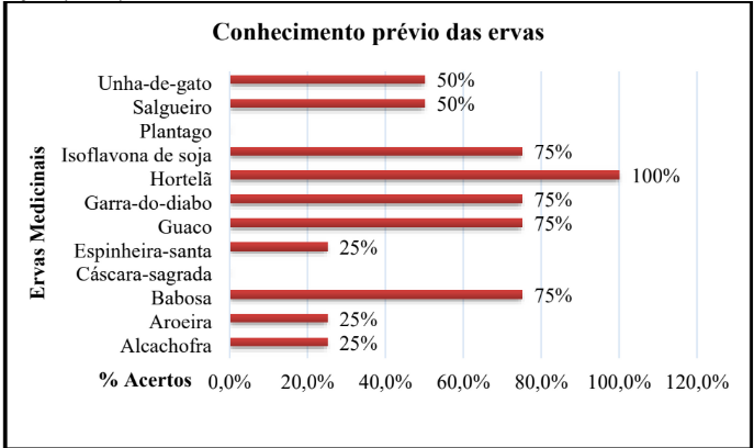 Figura 7: Gráfico de Barras Representação em percentual de acertos dos participantes em relação às indicações terapêuticas das plantas medicinais prescritas no SUS antes da gamificação (n = 4).