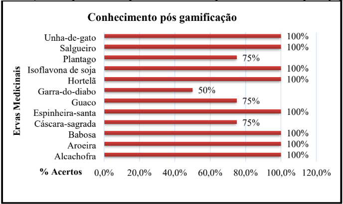 Figura 8: Gráfico de Barras Representação em percentual de acertos dos participantes em relação às indicações terapêuticas das plantas medicinais prescritas no SUS após o jogo (n = 4).