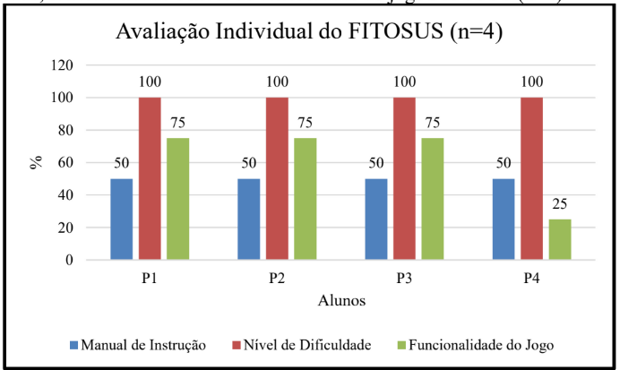 Figura 9: Gráfico de Barras da Avaliação Individual dos Participantes, acerca da aplicabilidade, funcionalidade e nível de dificuldades do jogo FITOSUS (n=4)