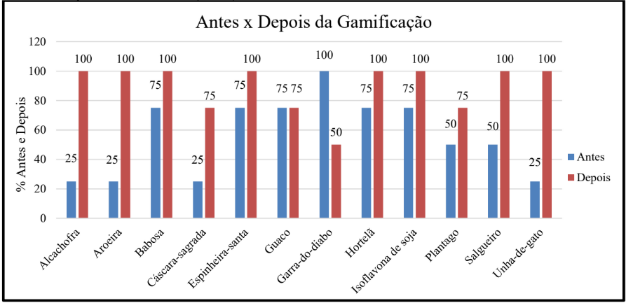 Figura 10: Gráfico de Barras Comparação do Conhecimento: Antes x Depois da Gamificação em percentual de acertos dos participantes em relação às indicações terapêuticas das plantas medicinais prescritas no SUS (n = 4).