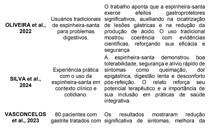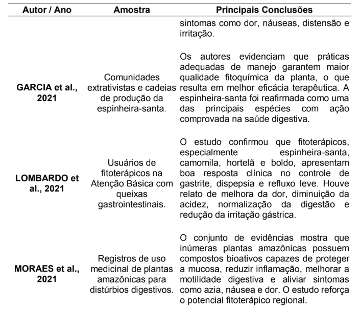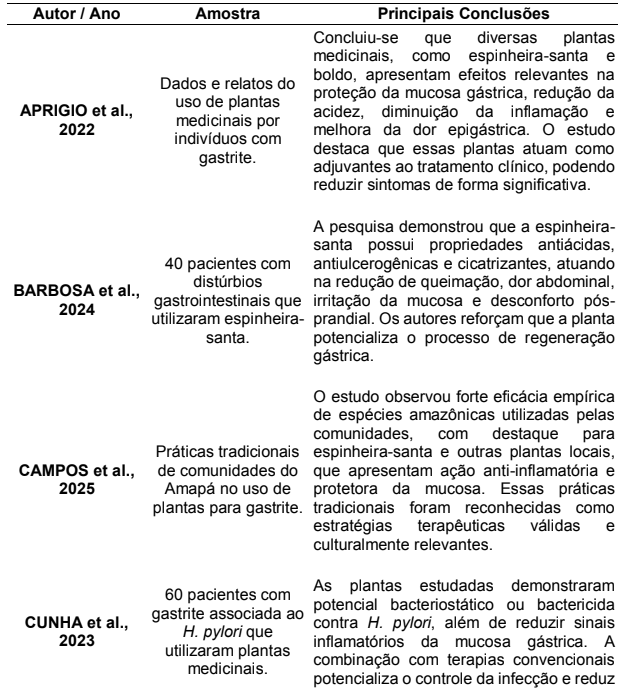 Para compreender melhor como diferentes autores têm investigado o uso de plantas medicinais, especialmente a espinheira-santa, no tratamento da gastrite e de outros distúrbios digestivos, foi elaborado um quadro síntese com os principais estudos encontrados. A tabela abaixo apresenta uma visão organizada das amostras avaliadas e das conclusões mais relevantes, permitindo identificar padrões de eficácia, usos tradicionais e evidências de ação terapêutica.