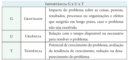 Uma ferramenta para priorizar problemas com base em três critérios: Gravidade, Urgência e Tendência. A gravidade avalia o impacto do problema, a urgência se refere ao prazo para resolvê-lo e a tendência se refere à sua evolução ao longo do tempo (Inácio et al., 2023). Santos et al. (2024) descreve a ferramenta como uma técnica que busca priorizar tarefas e problemas, a partir de medidas como gravidade, urgência e tendência.