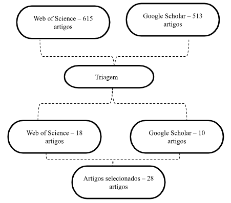 Após a aplicação dos filtros, foram encontrados 615 artigos na Web of Science e 513 artigos no Google Scholar. Com base nos documentos encontrados, deu início a leitura do resumo, e a partir da aderência sobre o tratamento da pesquisa, foram selecionados para compor o escopo do estudo um total de 28 artigos.