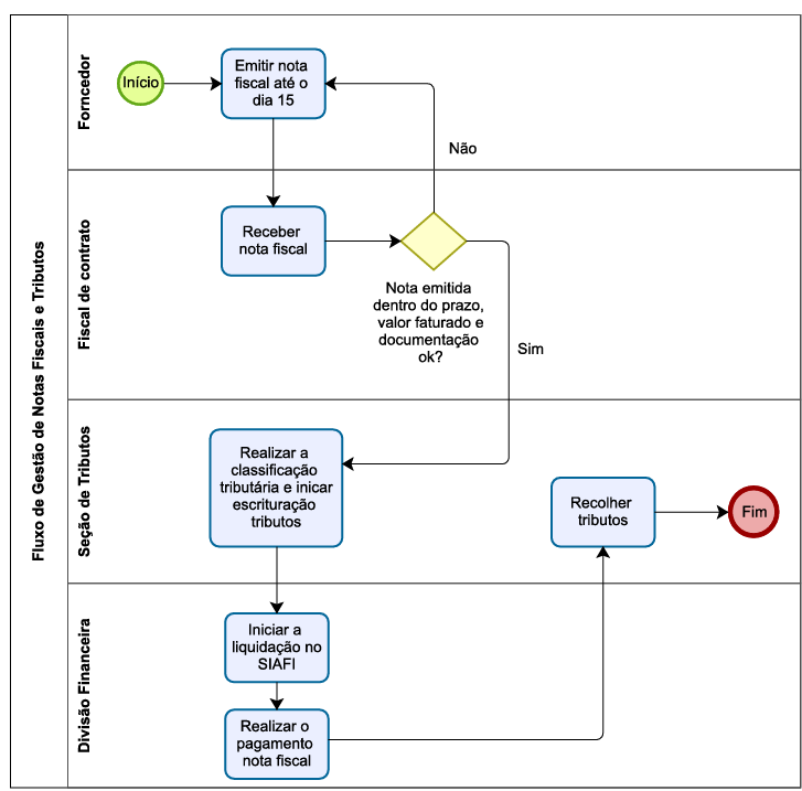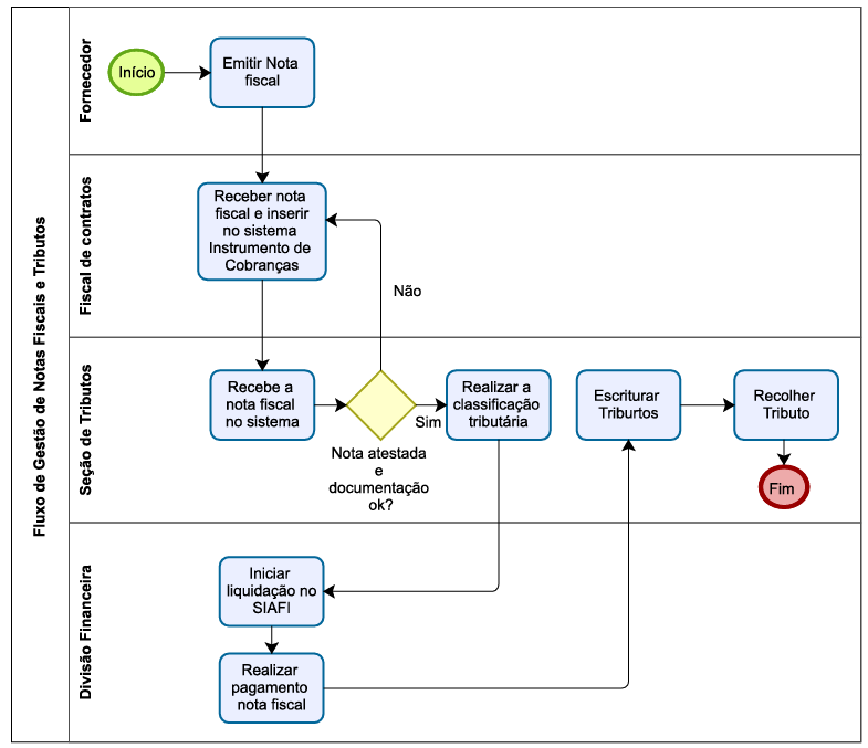 A seguir, apresenta-se o fluxo atual que compreende desde a emissão da nota fiscal até o recolhimento dos impostos federais, a etapa final da execução financeira.