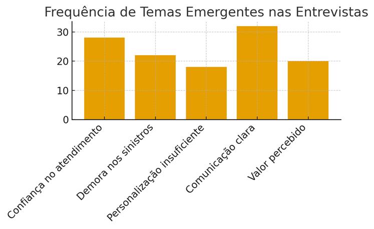 A análise qualitativa permitiu identificar um conjunto de temas recorrentes nas percepções dos clientes acerca da gestão de relacionamento desenvolvida pela seguradora. A partir da análise de conteúdo das entrevistas semiestruturadas, emergiram cinco categorias centrais: i) confiança no atendimento; ii) demora na gestão de sinistros; iii) insuficiência na personalização do serviço; iv) clareza na comunicação e v) valor percebido.