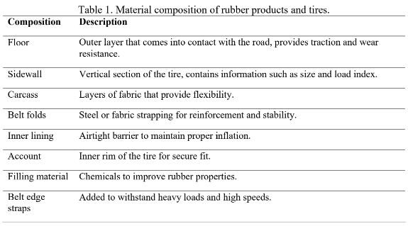 Rubber production in Southeast Asia exceeds 12.8 million tons and is projected to grow. Tires are composed of multiple materials—including rubber, fabrics, steel, plasticizers, and aditives (Table 1) — making the separation of components for recycling and processing complex (Danon et al., 2015).