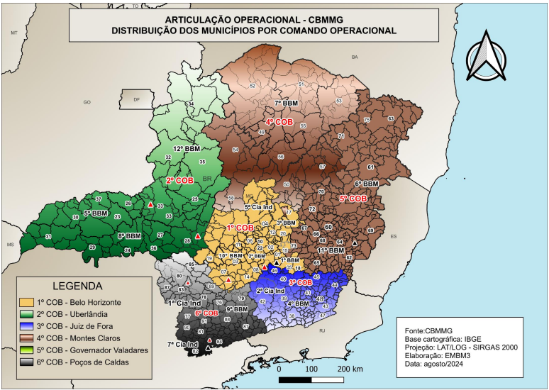 Na estrutura organizacional do CBMMG, os Comandos Operacionais (COB) são unidades de Direção Intermediária responsável pelo planejamento e gestão das operações de prevenção e combate a incêndios e sinistros, busca e salvamento, socorrimento público, defesa civil e perícia de incêndio em sua área de atuação, de acordo com as diretrizes, políticas e ordens emanadas pelo Comando-Geral (CBMMG, 2025).
