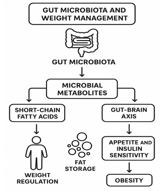 The flowchart illustrates the mechanisms through which the gut microbiota contributes to weight management and metabolic health. Gut microbes produce microbial metabolites, including short-chain fatty acids, that influence weight regulation by modulating fat storage and energy balance. At the same time, these metabolites interact with the gut-brain axis, affecting appetite control and insulin sensitivity. Together, these pathways determine whether the host maintains a healthy weight or develops obesity, highlighting the pivotal role of gut microbiota in metabolic regulation.