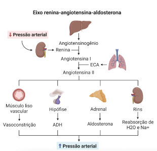 Um dos principais responsáveis por essa resposta é o sistema renina-angiotensina-aldosterona (SRAA). Diante da diminuição do fluxo sanguíneo renal, as células especializadas liberam renina, que estimula a produção de angiotensina II – uma substância que contrai os vasos e aumenta a liberação de aldosterona. Essa, por sua vez, faz com que o corpo retenha mais sódio e água, elevando o volume de sangue e, consequentemente, a pressão arterial.